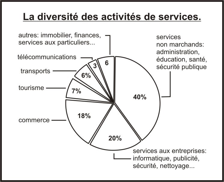 Il existe une grande diversité des espaces productifs de service. On peut distinguer par exemple les espaces dédiés à l’activité touristique, c’est à dire à l’accueil des vacanciers, et les espaces dédiés au commerce.