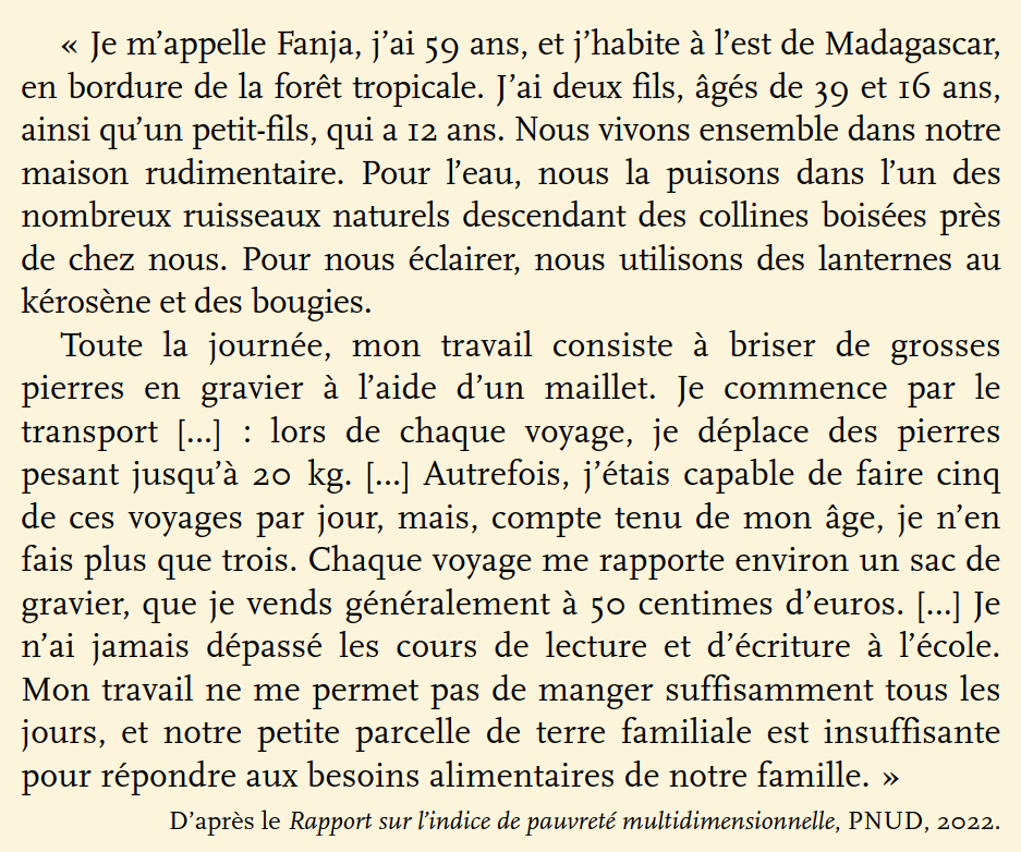 « Essayer de trouver les bons marqueurs pour mesurer la pauvreté me semble compliqué. On peut tout de même dire que tout individu dont les ressources limitent ses opportunités de se réaliser ou de mener la vie qu’il souhaite est pauvre. Être pauvre ne signifie pas seulement ne pas avoir assez de revenus, ou encore ne pas disposer de quoi financer une consommation confortable. C’est aussi ne pas avoir accès à une bonne éducation ainsi qu’à un bon système de santé. Mais la pauvreté recouvre d’autres facettes. Par exemple, dans le cas des femmes, ce serait « ne pas pouvoir réaliser ses ambitions ».